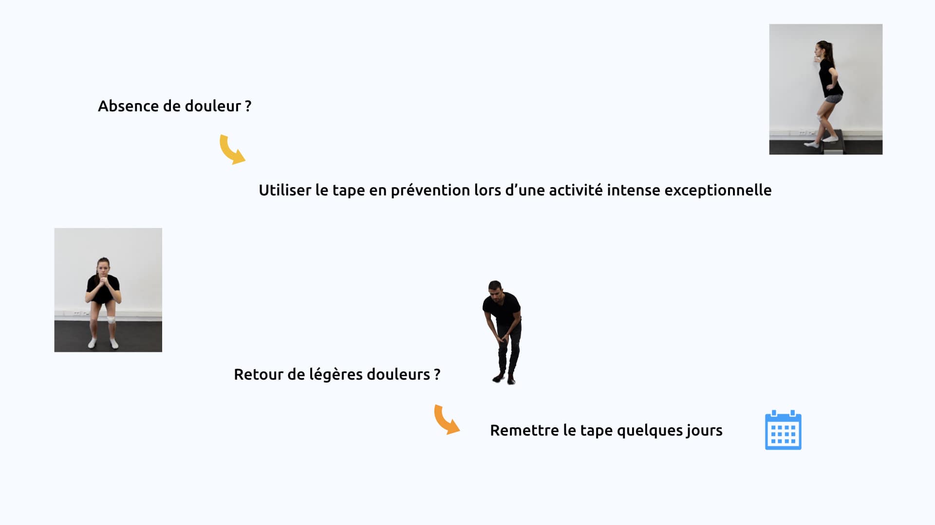 L’objectif général du tape va être de réduire toute combinaison de glissement (glide), d’inclinaison (tilt) et de rotation latérale de la patella afin de réduire les douleurs dans les activités initialement douloureuses. Même si en réalité, on sait qu’on ne corrige pas grand-chose étant donné que la position reste la même, on sait que le tape permet de soulager les douleurs chez certains patients : le vaste médial est typiquement plus activé en présence du taping. (Barton, Balachandar, Lack, & Morrissey, 2014). Ce taping interfèrerait avec le système nerveux et plus particulièrement au niveau des perceptions sensitives et proprioceptives, ce qui expliquerait son efficacité dans le soulagement de la douleur chez les patients SFP (La Clinique Du Coureur, 2019).